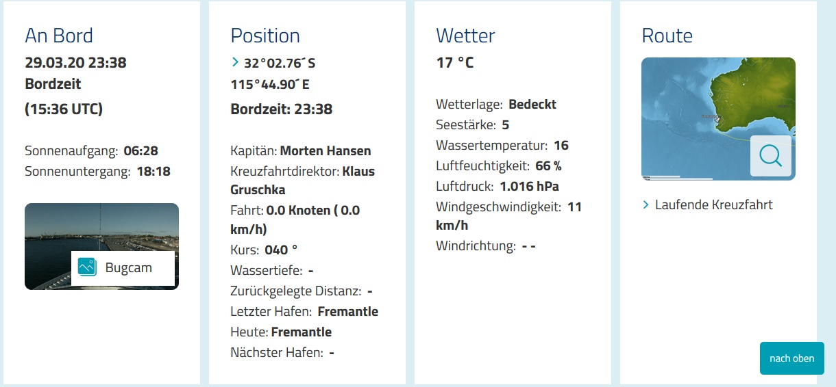 Die wichtigste Meldung des Tages kam bereits um 18:00 Uhr. Die australischen Behörden hatten die Erlaubnis erteilt, das wir für den Transfer zum Flughafen von Perth das Schiff verlassen dürfen. Phoenix hat 3 Flugzeuge gechartert, die uns am 28.3 (Flieger 1) und am 29.3.2020 (Flieger 2 und Flieger 3) nach Frankfurt fliegen würden.