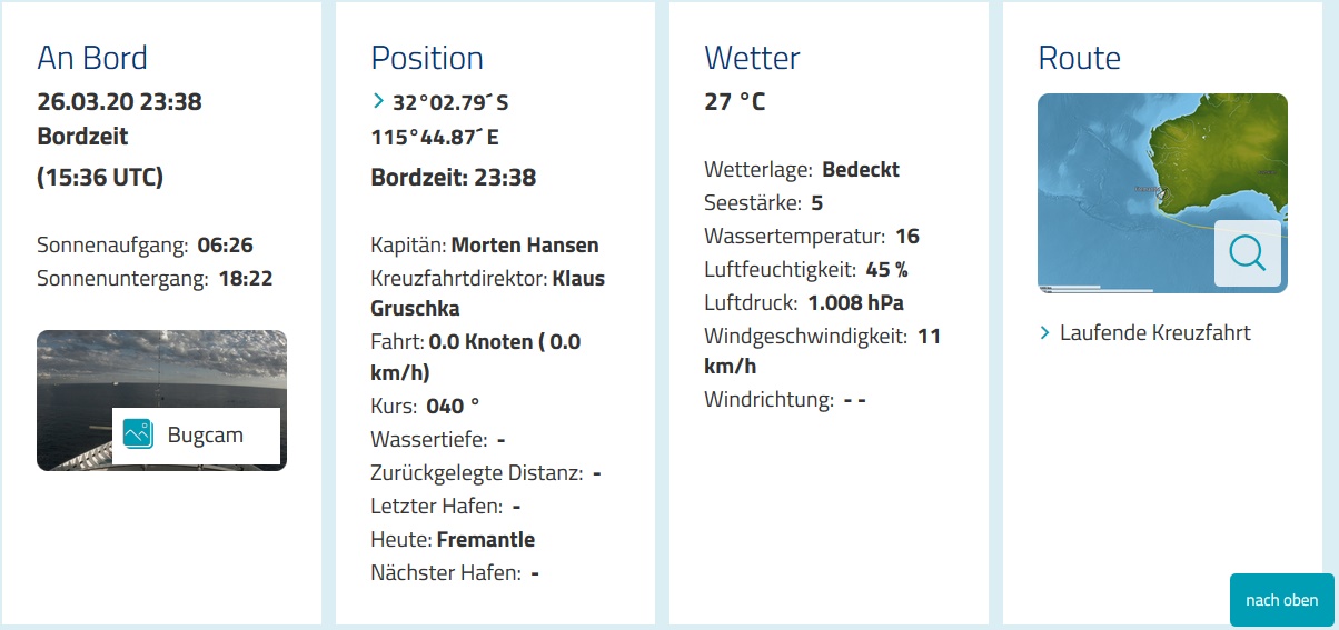 Noch vor einigen Tagen war in den australischen Zeitungen zu lesen, dass der Gouverneur des Bundesstaates West Australia wetterte, die Kriegsmarine werde die ARTANIA in nicht-australische Gewässer „begleiten“. (Diesen Ton und diese Art der Sprache kennen wir in Deutschland ja auch, nur geht es da nicht um Kreuzfahrtpassagiere, sondern um Flüchtlinge und Asylsuchende.)